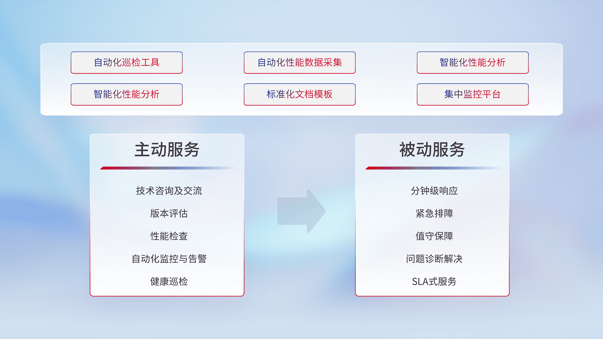 智能化工具和标准化文档,,,,保障服务质量,,,,提供主动服务(包含技术咨询、、、版本评估、、性能检查、、自动化监控与告警、、健康巡检)和被动服务包含(分钟级响应、、、、紧急排障、、、值守保障、、问题诊断解决、、、、SLA服务)。。。。