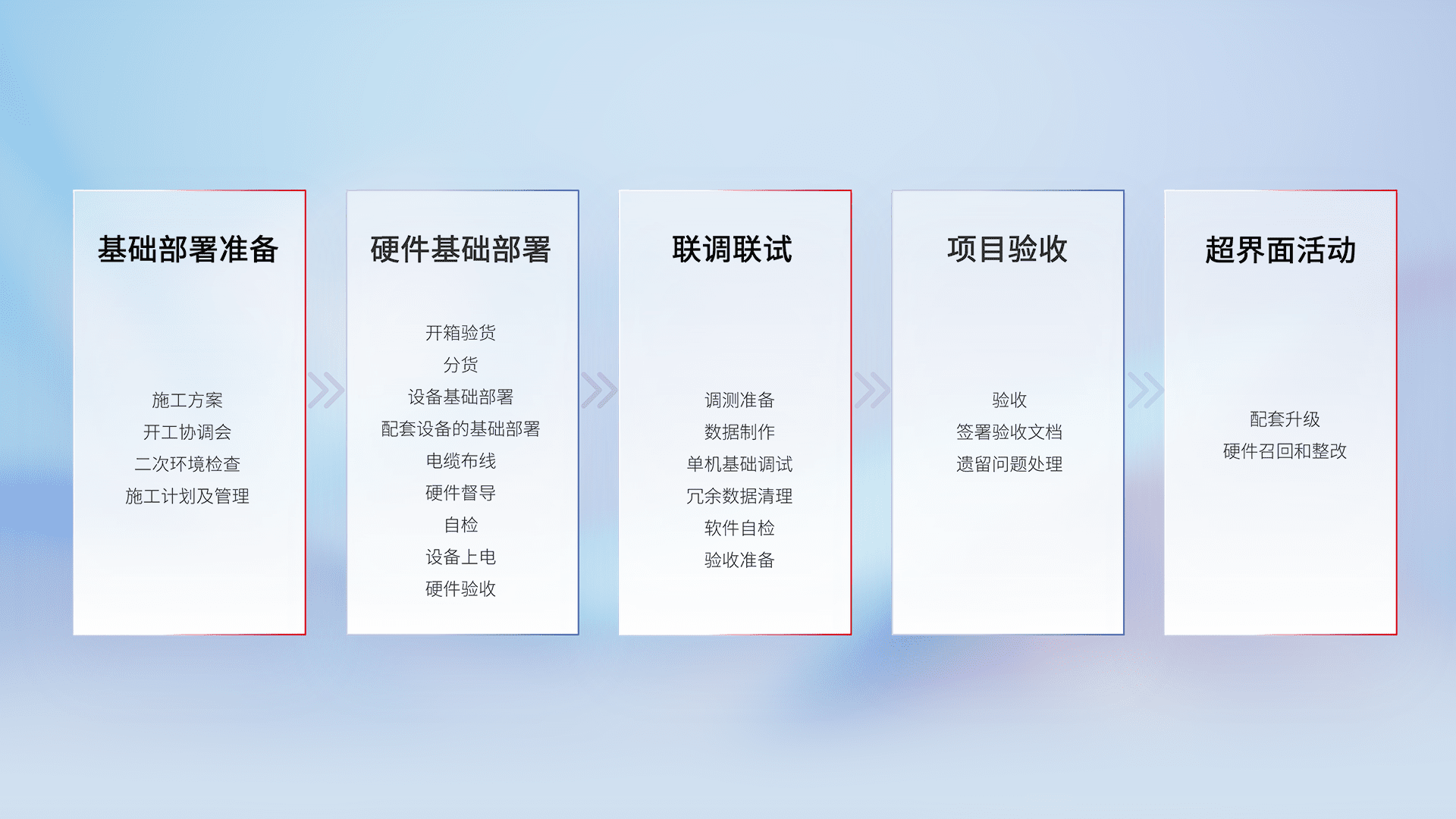 从基础部署准备、、、、硬件基础部署、、、联调联试、、项目验收、、、越界面活动的全过程可追溯,,,,保证施工质量和进度。。。。